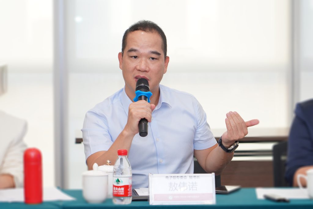 座谈会上,电子烟专委会秘书长敖伟诺向调研组介绍了电子烟行业发展现状及专委会近期重点工作,并就目前电子烟企业出海在知识产权打假维权、合规出海等方面遇到的问题进行了汇报。
