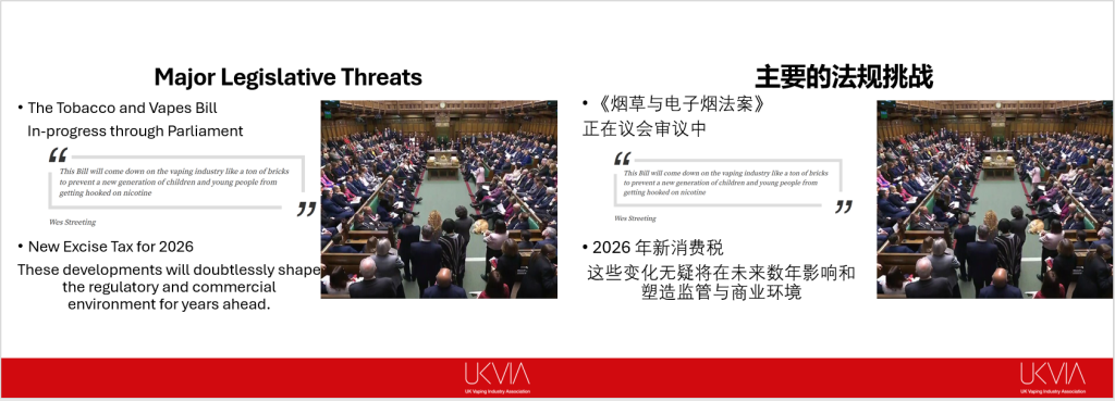 值得关注的是,英国国家统计局(ONS)数据显示,英国电子烟用户数量在2024年首次超越传统吸烟者,达540万人,吸烟率降至10.6%,为2011年以来最低。“这说明更多人正在转向危害更小的替代品,这是行业的骄傲。”John Dunne表示。