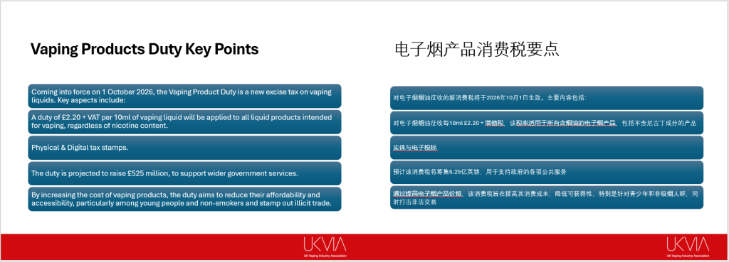 2026年10月1日起,英国将实施电子烟产品消费税(VPD),成为行业又一重要变量。该税项针对所有电子烟液,按每10ml征收2.2英镑+增值税,无论是否含尼古丁。配套实施的还有电子烟税标制度(VDS),通过实体与数字税标实现全链条追溯。
