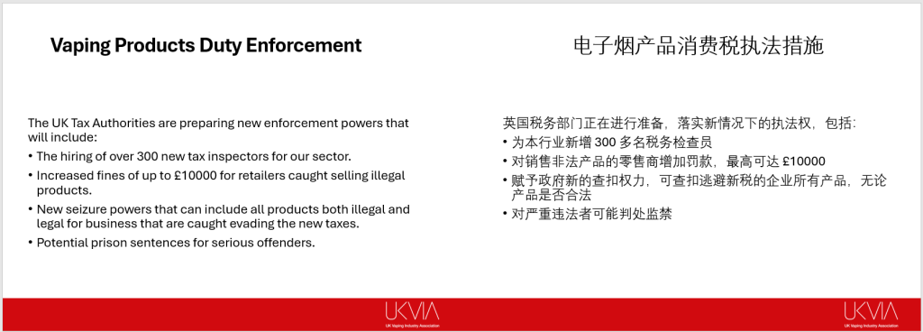 为配合新税实施,英国税务部门将新增300名专职税务稽查人员,违规销售非法产品最高罚款1万英镑,逃税企业的合法与非法产品均可被查扣,严重违法者或面临监禁。