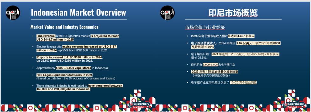 经济贡献突出:电子烟产业已成为印尼经济的重要组成部分,2025年市场营收预计达4.467亿美元。国家税收方面,电子烟消费税收入持续增长,2024年达1.67亿美元。出口表现尤为亮眼,2024年达3.26亿美元,年增长率高达25.5%。