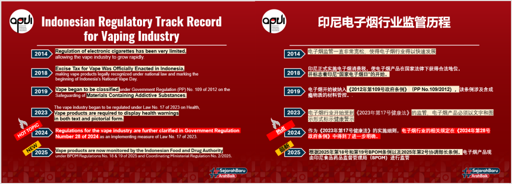 印尼电子烟监管经历了从宽松到规范的演进历程。2018年,政府开始实施电子烟消费税,正式在法律上承认电子烟产品;2019年,将其纳入《2012年第109号政府条例》的成瘾物质管控范畴;2023年,《健康法》要求产品标注文字及图示健康警示;2024年,出台《2024年第28号政府条例》,进一步细化监管要求。2025年,印尼食品药品监督管理局(BPOM)通过相关条例接手监管,标志着行业进入多部门协同监管的成熟阶段。