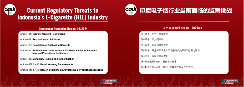 Budiyanto会长着重剖析了当前行业面临的主要监管挑战——《2024年第28号政府条例》的多项限制性条款,包括尼古丁含量限制、添加剂使用规范、包装标准化要求、教育机构200米范围内禁售、社交媒体广告禁令等。这些规定虽对企业运营提出更高要求,但也推动行业告别野蛮生长,向规范化方向发展。