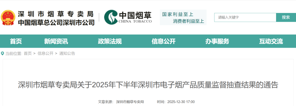 深圳市烟草专卖局关于2025年下半年深圳市电子烟产品质量监督抽查结果的通告