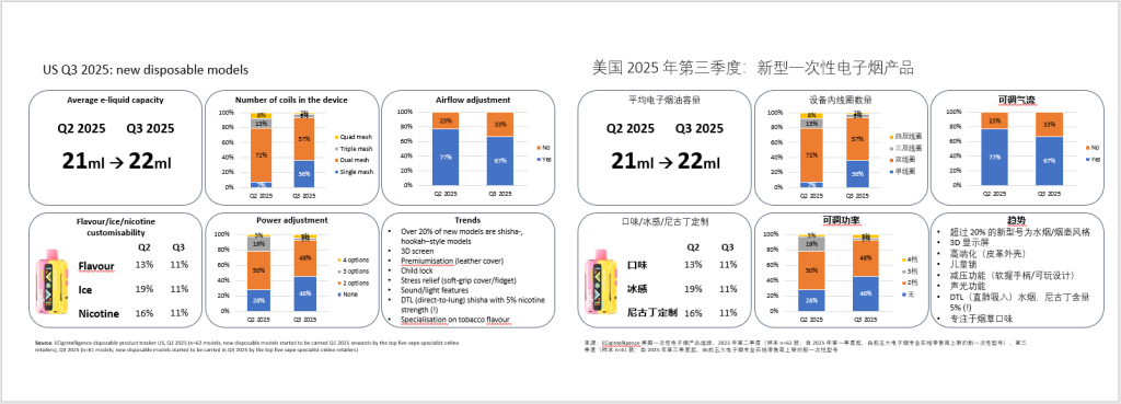 从美国市场2025年第三季度的新品特征来看,电子烟产品呈现简化、平价化趋势:烟油容量增长放缓,雾化芯数量减少,功率调节、口味定制等功能比例下降。