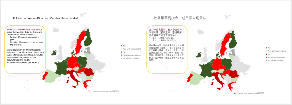 欧盟正在推进《烟草税指令》(Tobacco Taxation Directive),需27个成员国一致同意方可通过。目前成员国立场分歧明显,通过仍需时间。但Tim认为,最终通过的可能性较大,将统一设定最低税率,影响企业运营成本。