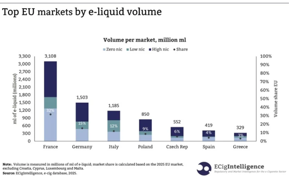 法国作为欧盟核心消费市场,开放式电子烟产品需求持续旺盛。据ECigIntelligence数据,法国电子烟用户烟油消耗量远高于欧盟其他国家,为烟油及开放式设备企业提供了广阔的市场空间。