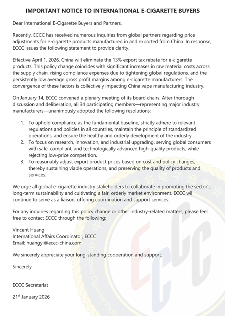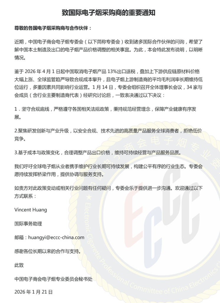 与此同时,专委会积极发挥国际沟通桥梁作用,已在英文官网发布会议公告,并同步向美国、英国、法国、加拿大、德国、俄罗斯、阿联酋、马来西亚等主要出口市场的行业协会、采购商及相关利益方通报情况,并通过他们进一步扩散至当地行业圈层。此举有助于稳定国际预期,传递中国电子烟产业规范化、可持续发展的信号,为有序调价创造理性透明的环境。