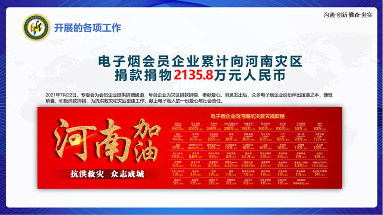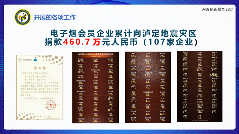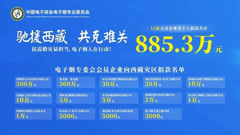 多年来,在一次次重大灾害面前,电子烟人从未缺席:2020年新冠疫情暴发,专委会第一时间组织会员企业为武汉捐款捐物累计达2453万元;2021年河南郑州洪灾,专委会再次发挥优良传统,组织会员企业捐款2135.8万元;2022年四川地震,专委会依然冲在前头,组织会员企业捐款460.7万元;2023年甘肃地震,专委会组织会员企业捐款868.27万元;2024年西藏地震,会员企业再度伸出援手捐款885.3万元。