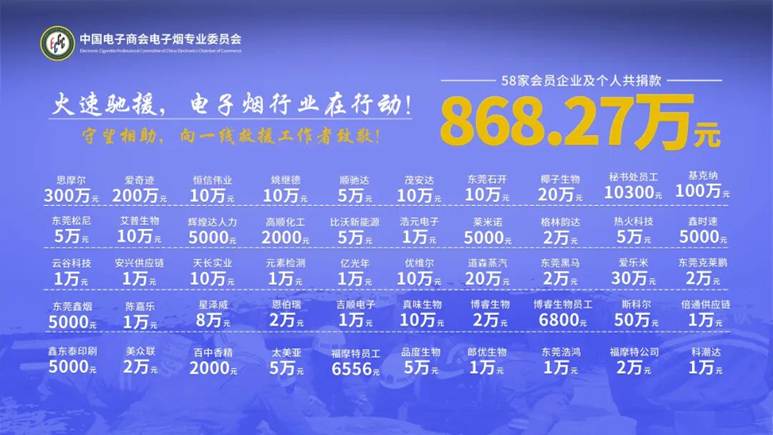 一方有难,八方支援。倡议发出后,众多会员企业积极响应、慷慨解囊,以实际行动展现电子烟企业勇于担当、甘于奉献的社会责任感。截至目前,已有6家会员企业捐款共计992万港币。详细名录如下: