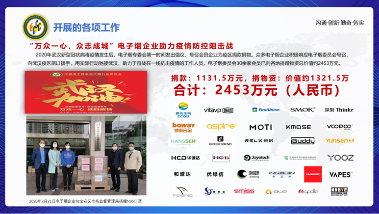 电子烟专委会自2017年成立以来,始终倡导会员企业积极参与公益活动,做有担当、有社会责任的企业。