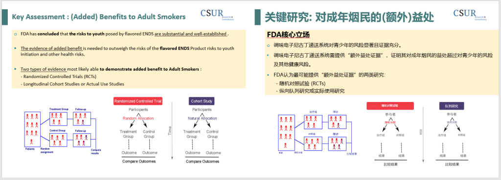 针对调味电子烟,FDA要求提供相比烟草风味的额外益处证据,以抵消其对青少年的已知风险。随机对照试验与纵向队列研究是FDA最认可的两类高级别证据。例如,CSUR为JUUL设计的ADJUSST研究发现,使用其产品6个月的成年烟民完全转化率显著提升,这为获批提供了关键支撑。