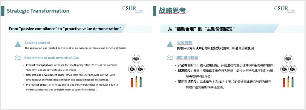 刘小娜博士特别提道:“随着PMTA审核流程的逐步简化,这为中国企业带来了难得的机遇。中国电子烟产业具备强大的制造实力与创新能力,只要精准把握合规要点、构建扎实的科学证据链,中国企业完全有能力获得属于中国品牌的PMTA通行证。CSUR作为行业的科学伙伴,也期待并愿意以我们的专业经验与研究能力,为中国企业的PMTA申报之路保驾护航,助力更多中国品牌在美国市场站稳脚跟、长远发展。”