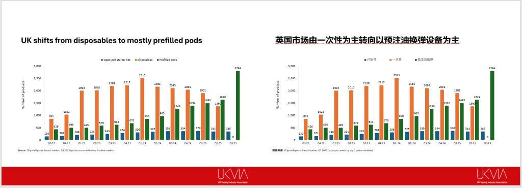 2025年6月1日,英国一次性电子烟禁令正式生效,标志着市场进入新一轮调整期。据John Dunne介绍,禁令后一次性电子烟市场占比显著下降,但仍存在非法渠道流通,且规模持续缩减。市场空缺迅速被预注油换弹式填补,并迅速成为主流。