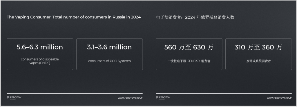 据Fedotov介绍,2024年俄罗斯成年电子烟用户总数已接近1000万人。其中,一次性电子烟(ENDS)消费者规模领先,达560万-630万;换弹式系统(POD)消费者为310万-360万,两类产品构成市场核心消费群体。