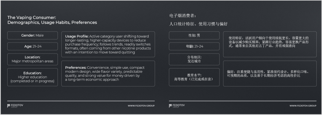通过每年3-4千份用户调研数据,Fedotov勾勒出俄罗斯电子烟用户典型画像:以男性为主,年龄集中于21-24岁,多居住于大城市,拥有高等教育背景。消费行为上:他们倾向选择续航更长、容量更大的设备以降低购买频率,乐于跟随趋势、更换产品形式,多从其他尼古丁产品转化而来,并普遍怀有戒烟意向。其消费偏好鲜明:注重便捷易用、设计现代、口味多样、品质稳定,且重视长期性价比。