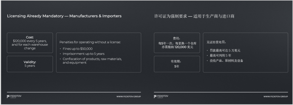 许可制度方面,成本与合规压力激增。生产与进口许可(已实施):费用高达12万美元/5年,且更换仓库需额外缴费。无证经营面临最高5万美元罚款、5年监禁及产品没收。批发与零售许可(2026年新增):批发许可证1万美元/5年,仓库变更需重新缴费;零售许可证250美元/店/年。关键时间节点:2026年3月1日开始发放许可证,2026年9月1日必须持证经营,2027年9月1日完成全部许可条件提交。此举预计将大幅清理不合规的中小批发商和零售商,加速行业整合。