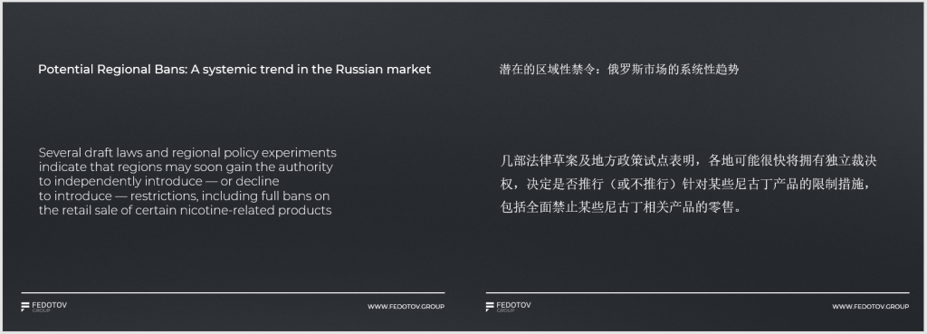 值得关注的是,区域禁令成为潜在风险点。目前已有多部法律草案及地方政策试点显示,俄罗斯 85 个地区未来可能获得独立裁决权,可自主决定是否对一次性电子烟、加热不燃烧产品、各类烟油等实施零售禁令。这将导致市场碎片化,企业需要针对不同区域制定差异化的合规与销售策略。