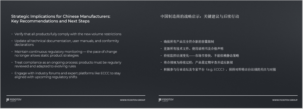 针对俄罗斯市场的监管变革,Fedotov对中国制造商提出核心建议:一是确保产品完全符合新的容量限制等技术要求;二是及时更新技术文件、用户手册及合格声明;三是建立持续的法规监控机制,避免依赖静态产品策略;四是将合规视为长期过程,定期审查产品以适配不断变化的规则;五是积极参与ECCC等行业论坛与专家平台,精准把握法规动态。