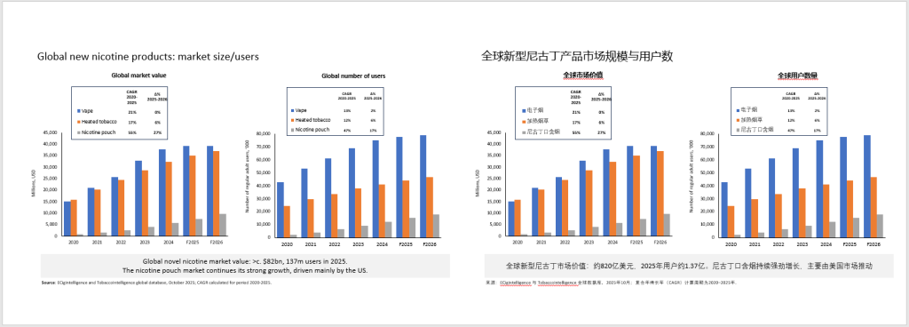全球烟草市场正经历结构性变革,新型尼古丁产品成为增长核心引擎。数据显示,2025年全球新型尼古丁产品用户预计达1.37亿,市场规模预计约820亿美元。其中,电子烟作为绝对主力,不仅在用户数量上占据主导,市场规模也位居各细分品类之首,即便增速略有放缓,2020-2025年仍保持21%的复合年增长率。