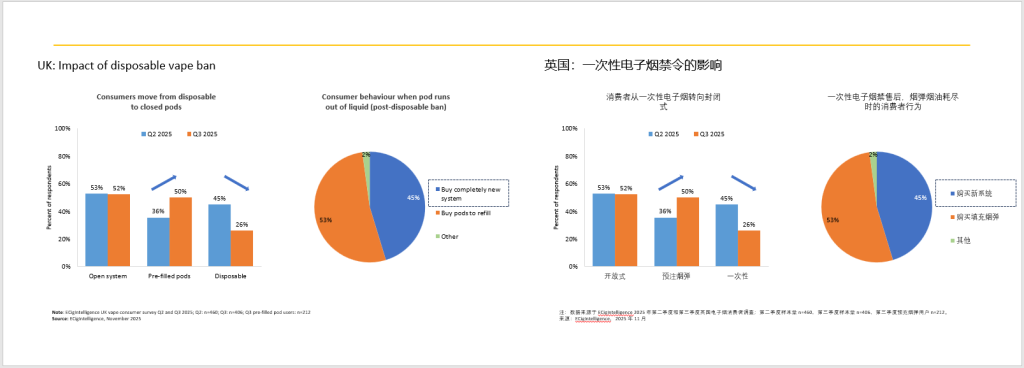 一次性电子烟禁令已在英国实施,并预计将在欧盟及其他地区推广。英国市场反应颇具启示:禁令前,已出现从“一次性”向“一次性大口数”过渡的趋势;禁令后,快速转向“2+10”产品(即2ml烟弹+10ml补充装),成为封闭式产品的主流形态,印证了行业对监管的预判与适配能力。