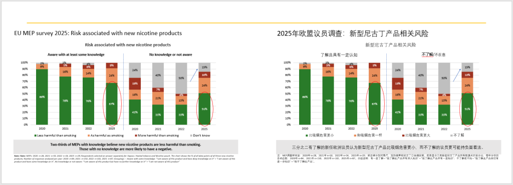 一项针对欧洲议员的年度调研显示:了解电子烟的议员中,三分之二认为其比吸烟危害更小;不了解的议员则更容易持负面看法。这种“认知分化”正在加剧,而正是这些议员将决定下一版《烟草产品指令》(Tobacco Products Directive)的走向。