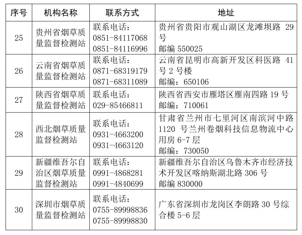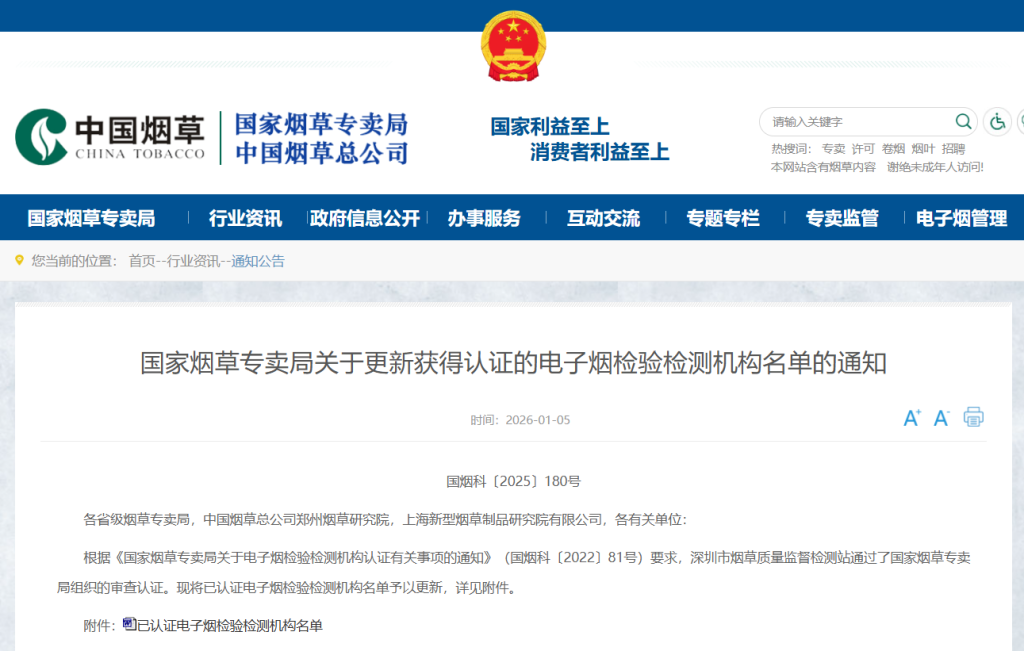 根据《国家烟草专卖局关于电子烟检验检测机构认证有关事项的通知》(国烟科〔2022〕81号)要求,深圳市烟草质量监督检测站通过了国家烟草专卖局组织的审查认证。现将已认证电子烟检验检测机构名单予以更新,详见附件。