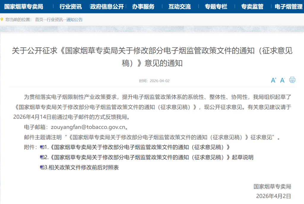 为贯彻落实电子烟限制性产业政策要求,提升电子烟监管政策体系的系统性、整体性、协同性,我局组织起草了《国家烟草专卖局关于修改部分电子烟监管政策文件的通知(征求意见稿)》,现公开征求意见。有关意见建议请于2026年4月14日前通过电子邮件的方式反馈我局。